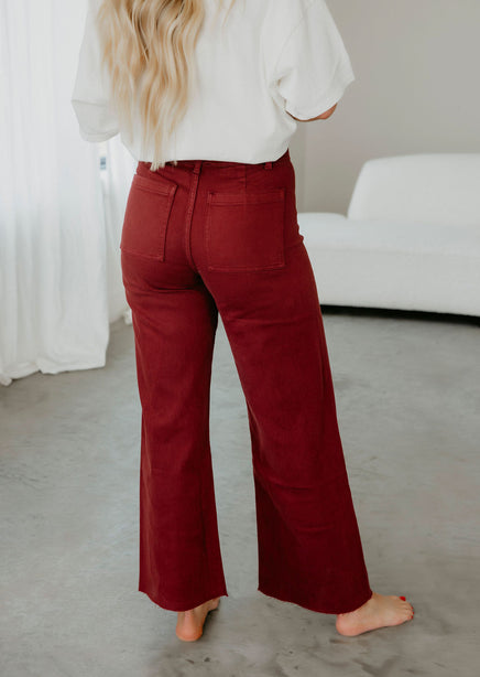 Take your style game to the next level with the Amelia Wide Leg Jean! These uber stylish jeans check all the right boxes with the wide-leg silhouette and high-rise cut. Features two back pockets, a zip fly, and a single-button closure. Shaped by stretch denim and finished with a cropped, raw hem that allows you to showcase your favorite footwear! Miou Muse brand. Nessa is wearing a small.