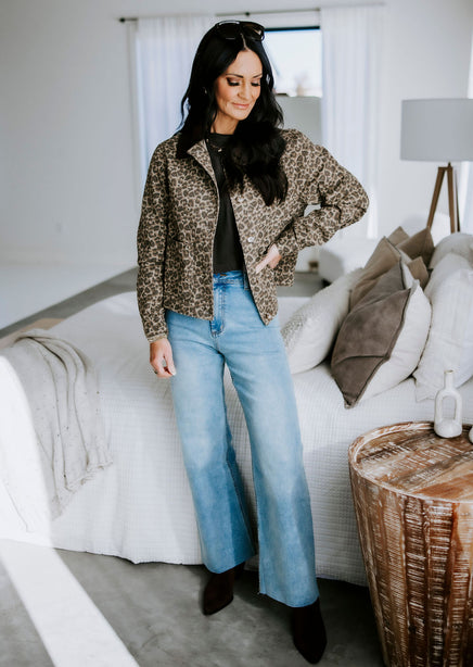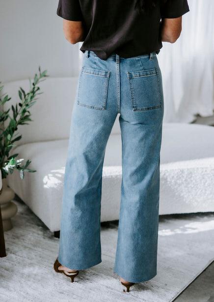 Take your style game to the next level with the Amelia Wide Leg Jean! These uber stylish jeans check all the right boxes with the wide-leg silhouette and high-rise cut. Features two back pockets, a zip fly, and a single-button closure. Shaped by stretch denim and finished with a cropped, raw hem that allows you to showcase your favorite footwear! Miou Muse brand.  Laurie is wearing a small.