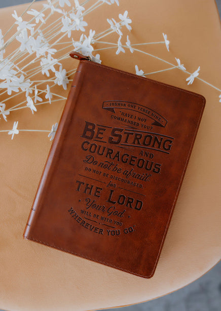 • Toffee-brown faux leather zipper pull with antique gold rivet