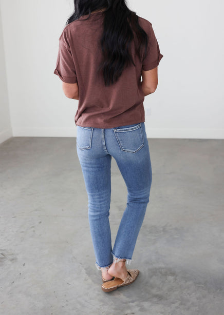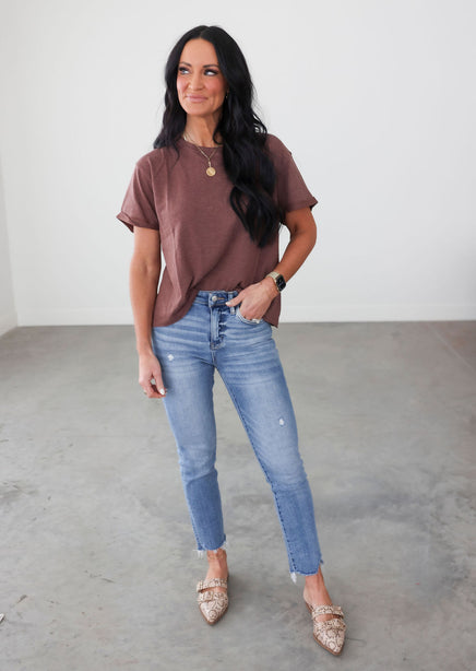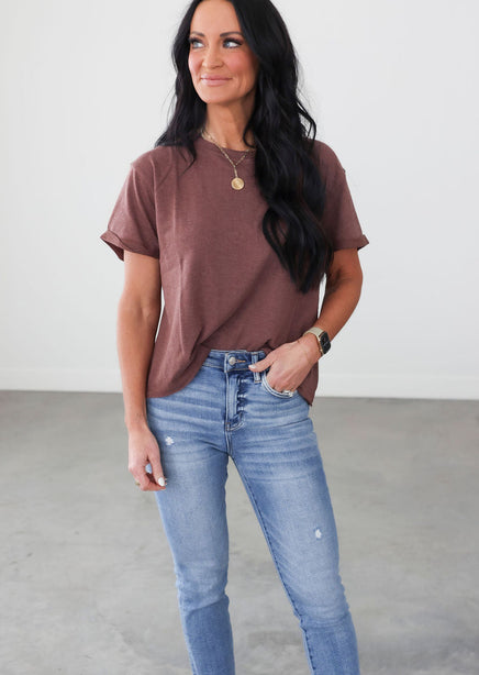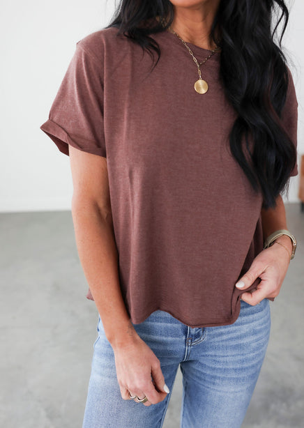 The perfect tee doesn't exi... Lightweight, adorable, and kicked up a notch with attention to detail. This sweet tee features roll cuff sleeves that are secured with a stitch, V stitching along the neckline, and a raw hem. The slightly oversized, boxy fit will make it a comfy staple you're sure to go back to time and time again. Pair with workout leggings and sneakers, or jeans and a utility jacket. The pairing possibilities of this tee are endless.