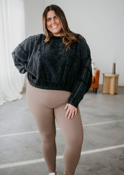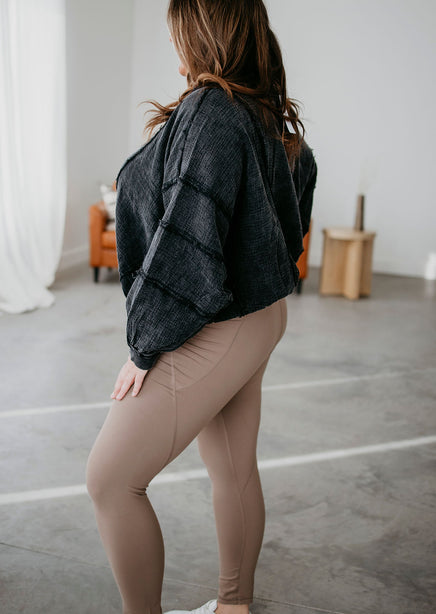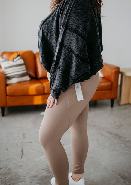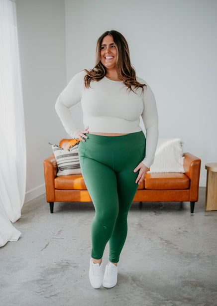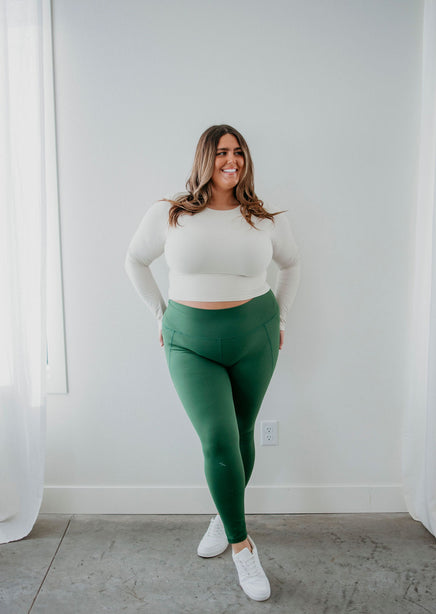 This pair of solid leggings come with side pockets and no embellishments for a demure and versatile look. Features tapered waistband, four-way stretch, and tummy-control but with less restriction allowing you to move with more freedom. Mono B brand. Fits true. Loghin is wearing a 1XL. Kaylee is wearing a 2XL.