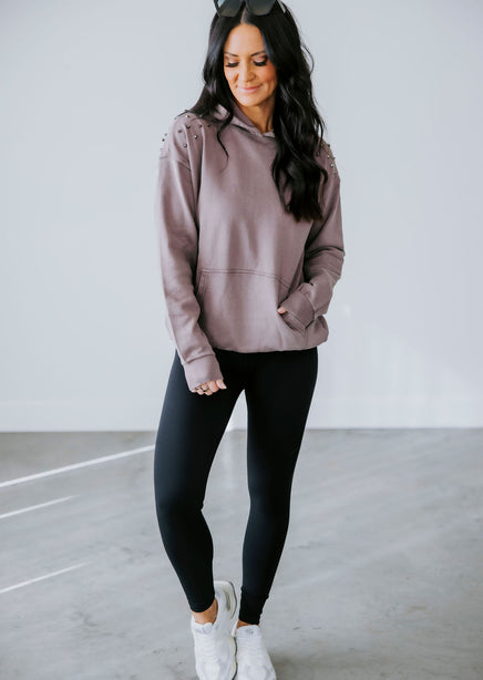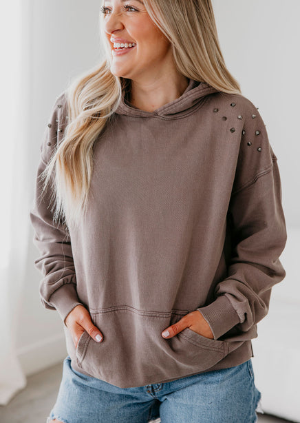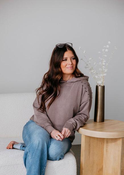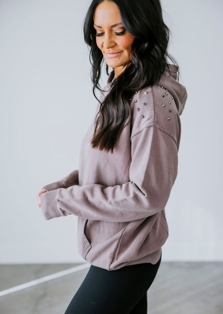 This East Studded Hoodie by Lily & Lottie is perfect for adding a touch of edginess to your wardrobe. Featuring studded details along the shoulders, a hooded neckline, and a relaxed fit, this hoodie is both stylish and comfortable. Embrace a unique and chic look with this must-have hoodie.