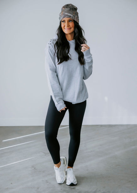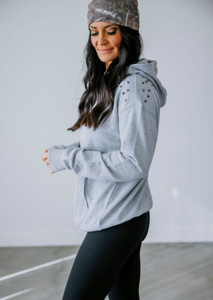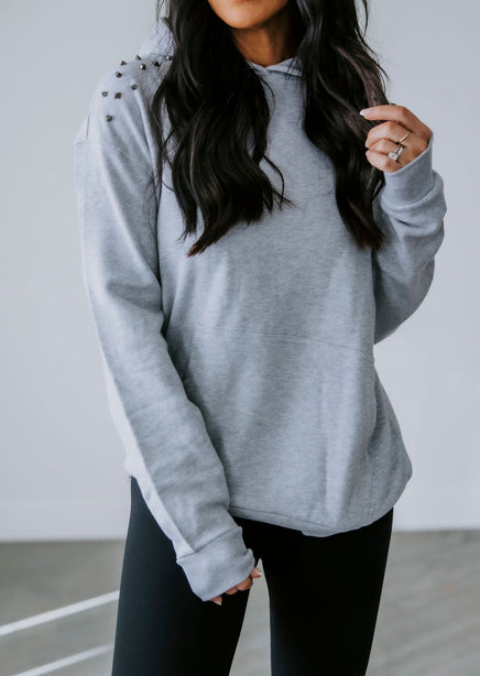 This East Studded Hoodie by Lily & Lottie is perfect for adding a touch of edginess to your wardrobe. Featuring studded details along the shoulders, a hooded neckline, and a relaxed fit, this hoodie is both stylish and comfortable. Embrace a unique and chic look with this must-have hoodie.
