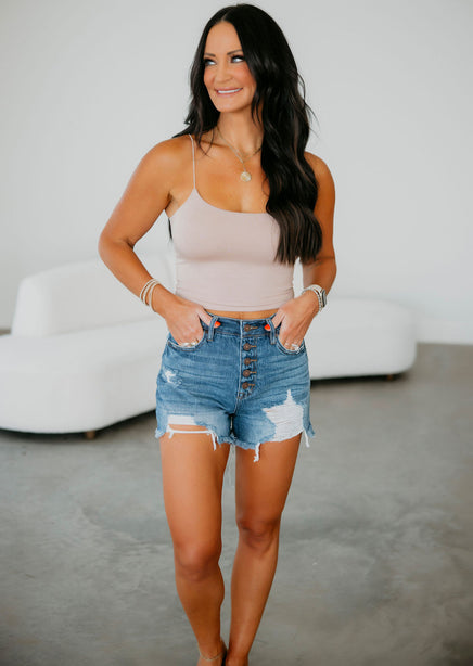 Complete your off-duty looks with the Emilia KanCan Distressed Shorts. These dark-washed shorts are crafted from sturdy, dark-washed denim with a comfort stretch waistband. The five-pocket cut is styled with a button fly, distressing, and frayed hems. Sits right above the waist for a fit that highlights your curves. Laurie is wearing a size 3.
