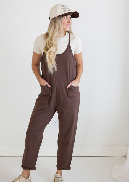 The Gaven Pocketed Jumpsuit is a must-have for any fashion-forward woman. With spaghetti straps, convenient pockets, and a relaxed fit, this knit jumpsuit provides both comfort and style.