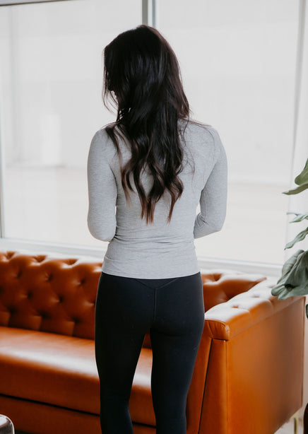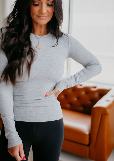 A soft, long sleeve ribbed knit top is always the best way to update your athleisure basics. This essential piece wears with four-way stretch and a bodice that accentuates curves with a comfortable and figure slimming fit. This versatile piece can be styled in a variety of ways (workout or workday). Mono B brand. Madison and Laurie are wearing a size small.