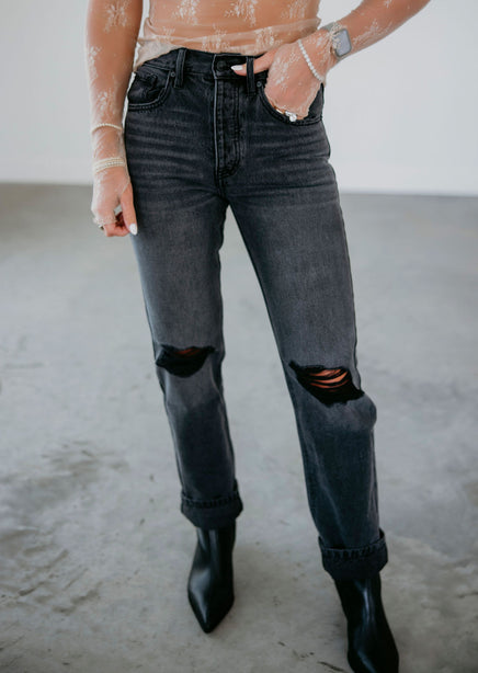 The '90s called and they want to tell you how good you look in the Kody KanCan Boyfriend Jeans. The sturdy, black-wash denim shapes these 90s boyfriend jeans with a high-waisted fit and a five-pocket cut. The straight legs have whiskering and distressed knees and can easily be cuffed. Laurie wears a size 26.