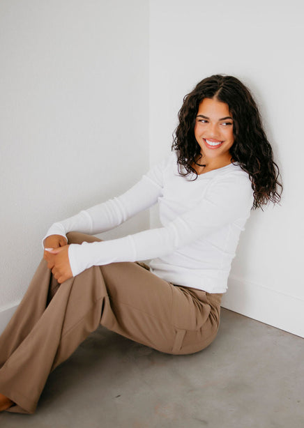 Upgrade your collection of basics with this soft long sleeve top! Once you put this on and see how wonderful it feels, you will want to get it in every color! Features a crew neck and ribbed long sleeves. Lightweight fabrication makes this top perfect for layering. Destined to be one of your go-to faves! Whether she's worn alone or layered under a slip dress this top is seriously cute! This beyond-basic tee starts with a stretchy knit construction, complete with ribbed accents at the sleeves and neckline. Always the perfect pick for your fave high-waisted jeans.