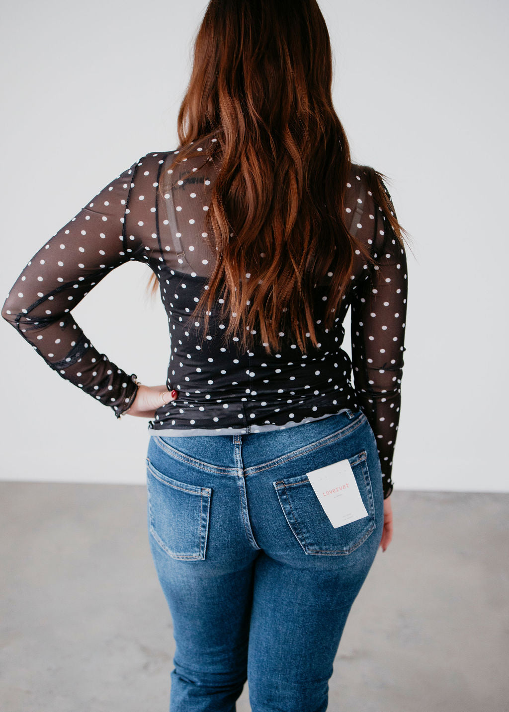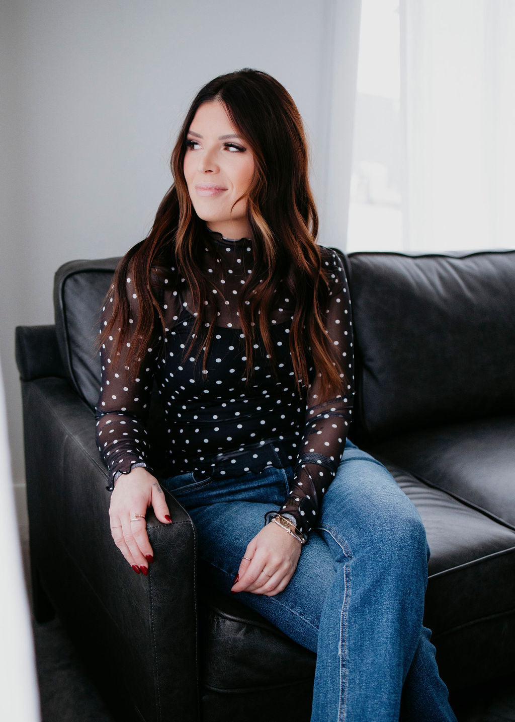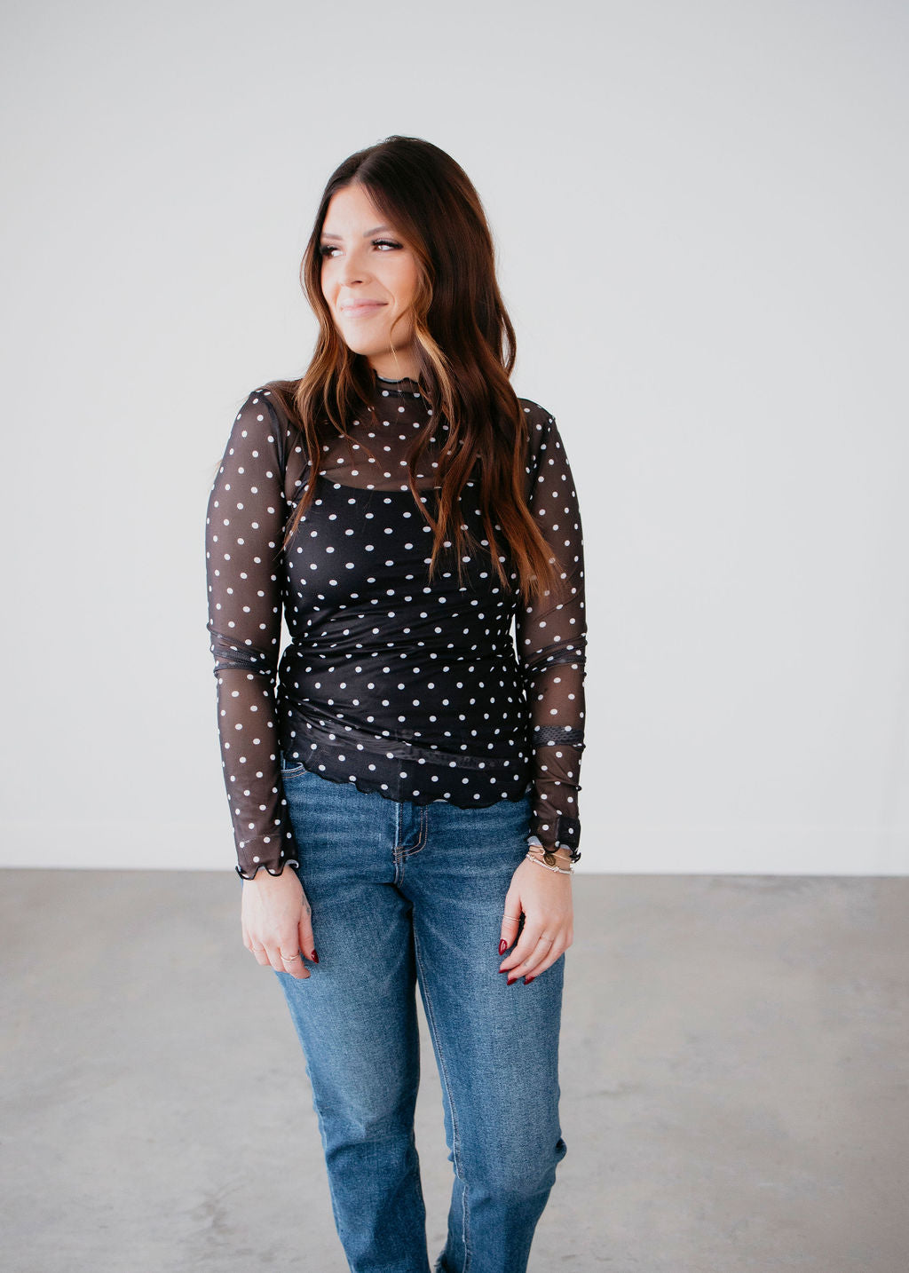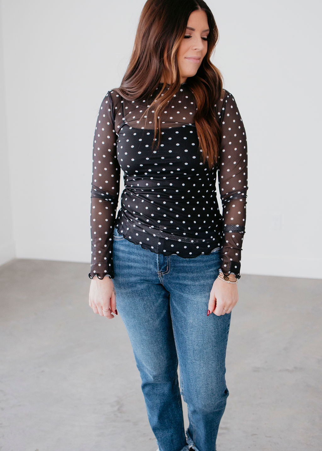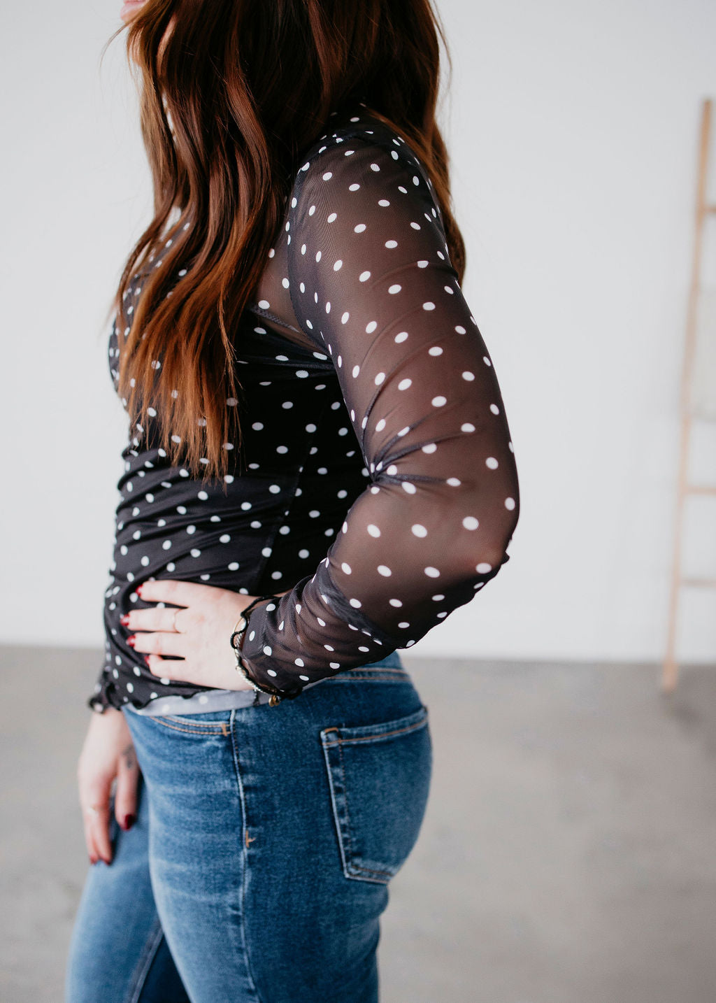 Len Polka Dot Mesh Long Sleeve Top