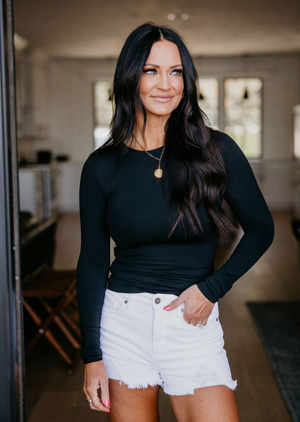 From ice cream dates to beach bonfires, these white distressed cut-off shorts are ready for all of your warm-weather adventures. Designed in a high-rise fit with a classic five-pocket cut and nice stretch. Kara is wearing a size medium.