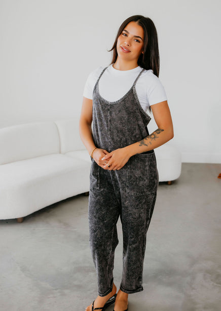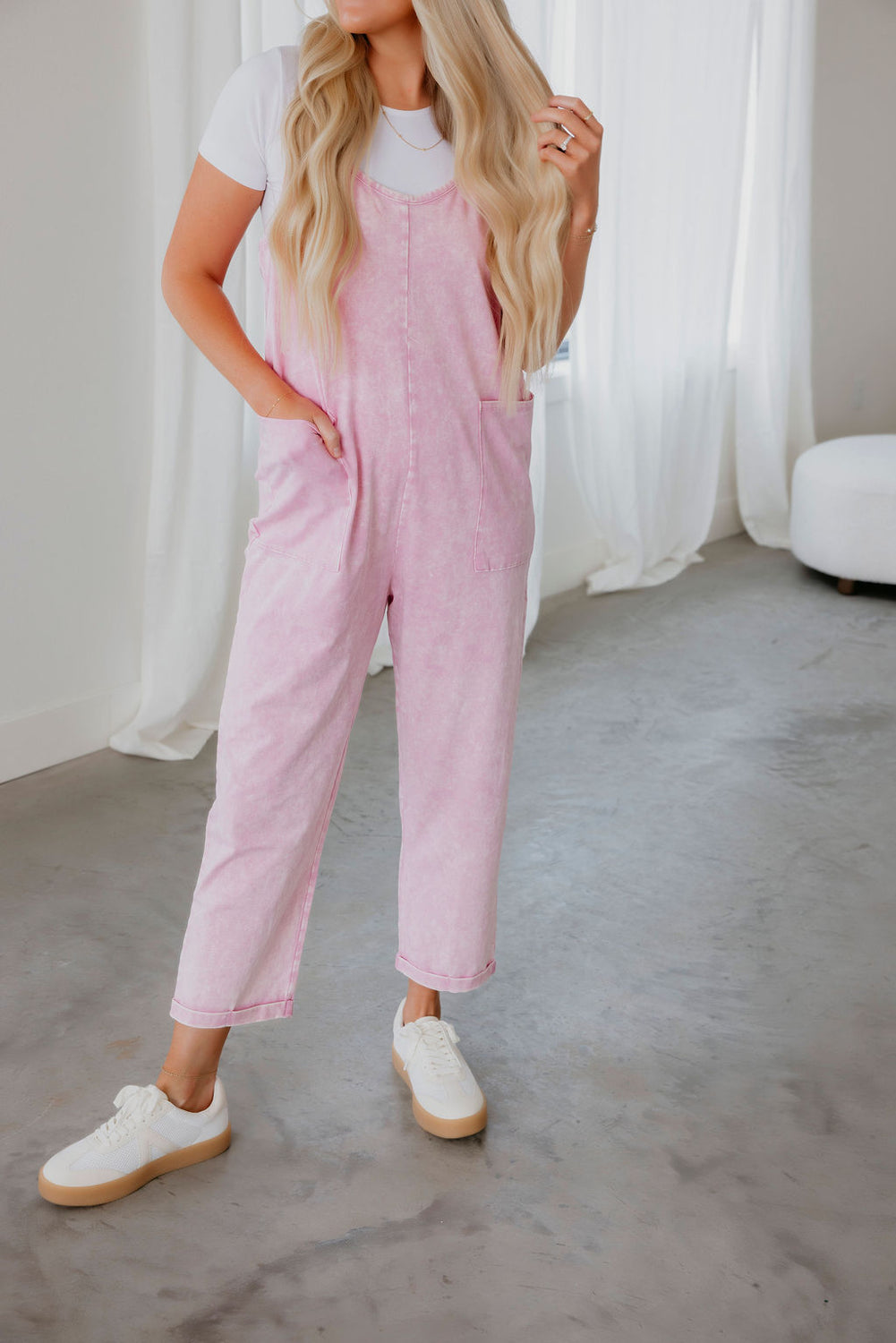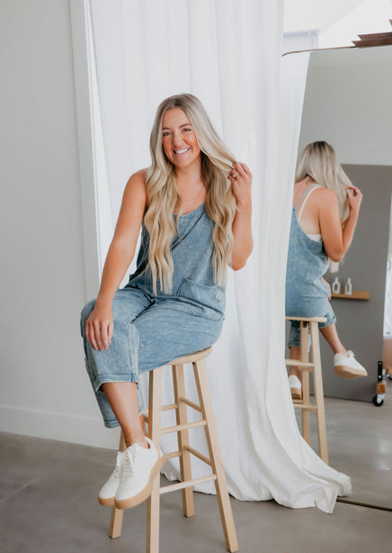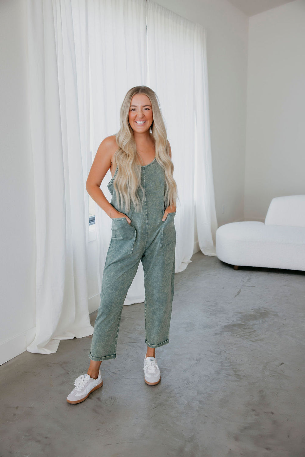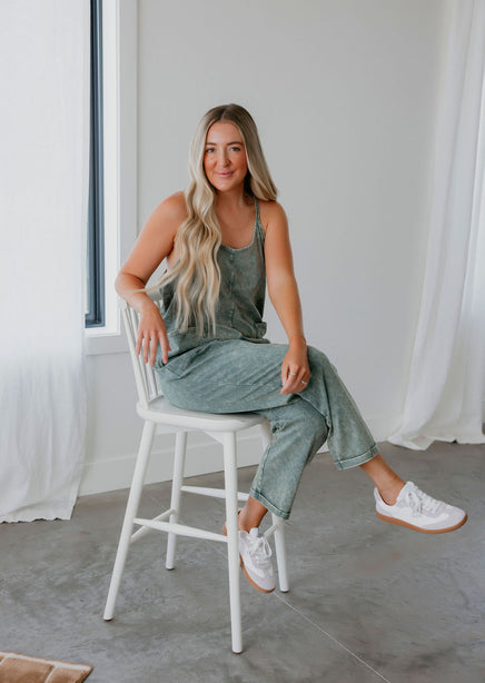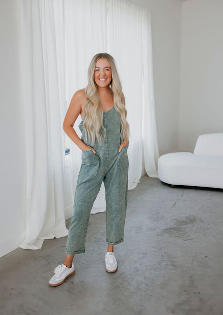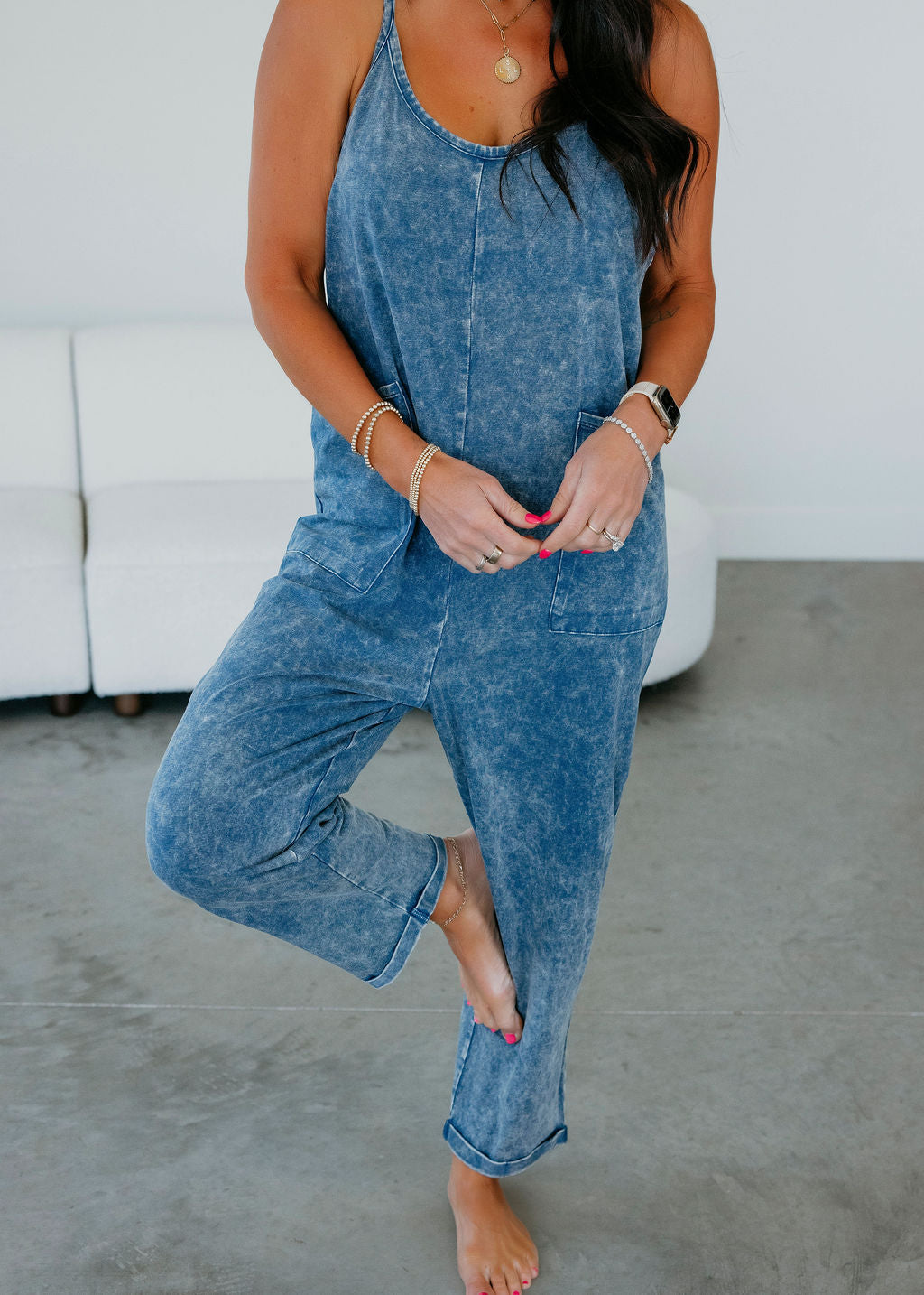 With washed coloring, spaghetti straps and a loose fit, it provides a relaxed and casual look. The V-neck adds an elegant touch, while the pockets add practicality. Laurie, Nessa and Serenity are wearing a size S-M.