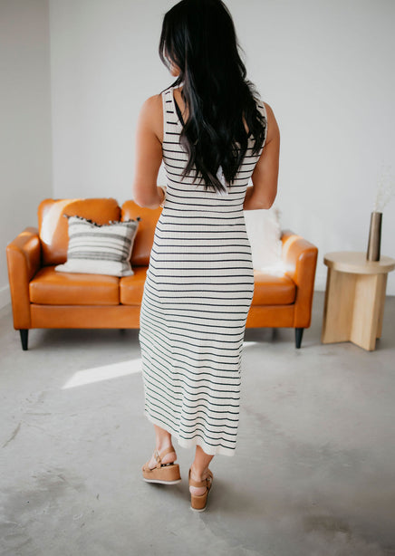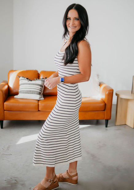 The Ora Striped Maxi Dress boasts a knit sleeveless design and U-shaped neckline, perfect for a chic and comfortable summer look. Its timeless striped pattern adds a touch of style to any wardrobe. Laurie is wearing a size small.