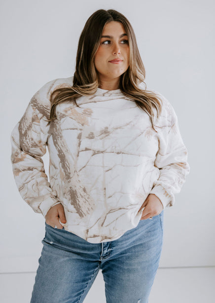 Stay warm and stylish with the Sand Dune Camo Crew by Lily & Lottie. This crew features a unique branch and leaves camo pattern, along with a cozy interior fleece lining. The relaxed fit, crew neckline, and long sleeves make this a must-have for any adventure. Pair with the Sand Dune Camo Joggers for a matching outfit!