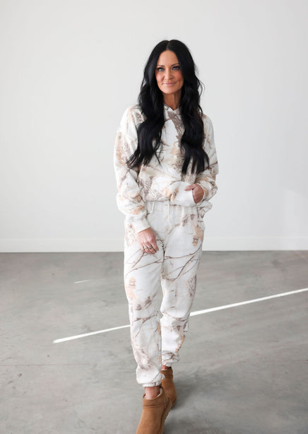 Stay camouflaged and cozy with the Sand Dune Camo Hoodie by Lily & Lottie. The subtle leaves and branch camo design, along with the fleece interior, makes this hoodie perfect for blending in with nature while staying warm. The hooded neckline and kangaroo pocket add extra functionality to this must-have wardrobe staple.