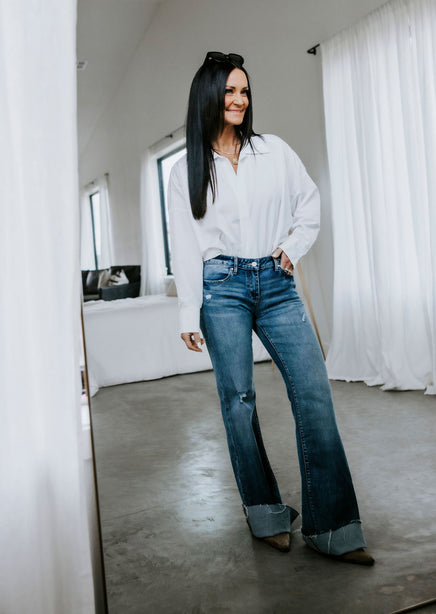 - Deep V collared neckline with snap closure