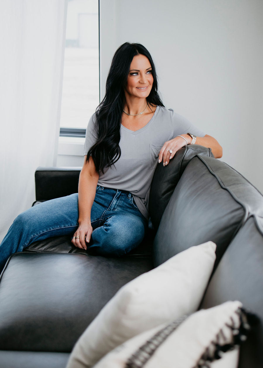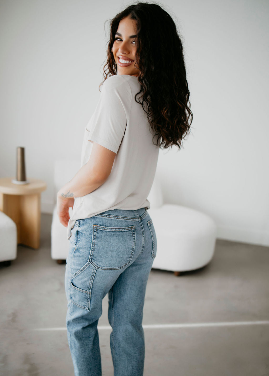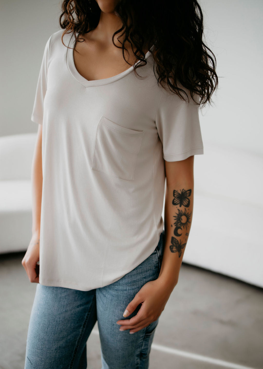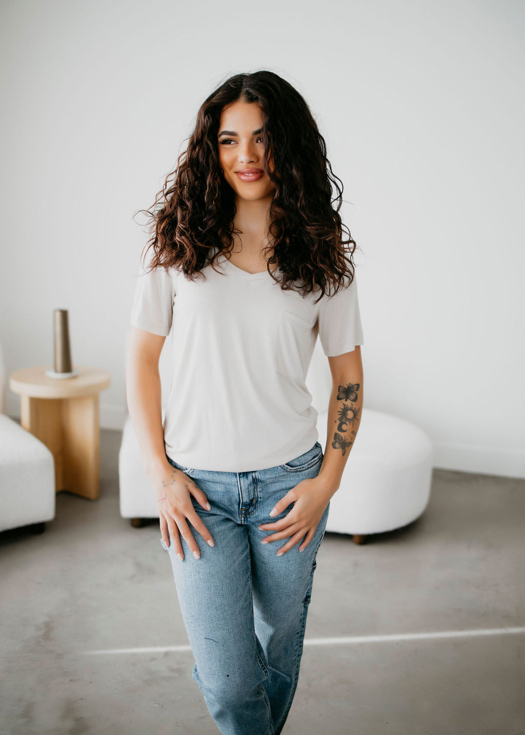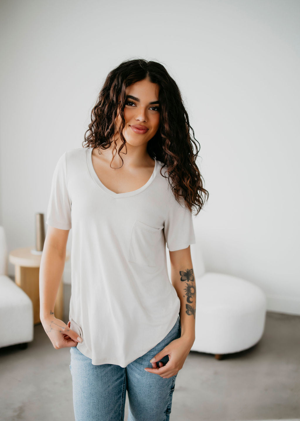 This ultra-soft tee is cut from a high-quality jersey, which contains added stretch for comfortable wear and an effortless drape. Complete with a relaxed fit, V-neckline, slouchy raw-edge pocket, and a single chest pocket. Trinity, Baylee, Kara and Laurie are wearing size smalls. Kaylor is wearing a size medium.