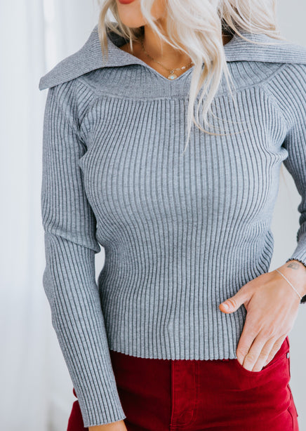 Crafted from ribbed knit fabric, the sweater features a boat neckline, oversized foldover collar, and long sleeves for all-day comfort. Kaylor is wearing a size medium.